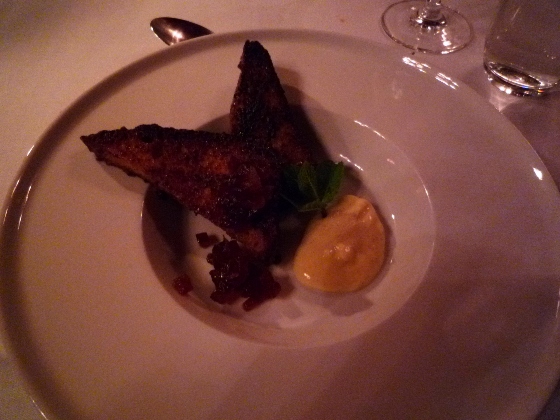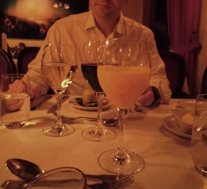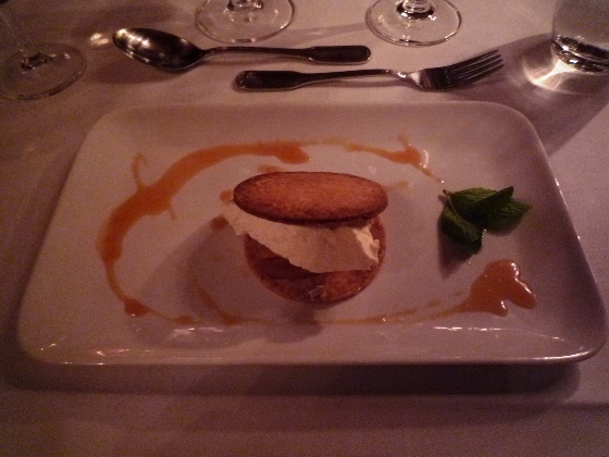 こちら、アンちゃんのチョイス。前菜は私と同じサーモン、メインに子牛肉、デザートはブランデーか何かをしみこませたタルト。そして食後にコニャックを満足そうに飲んでました。