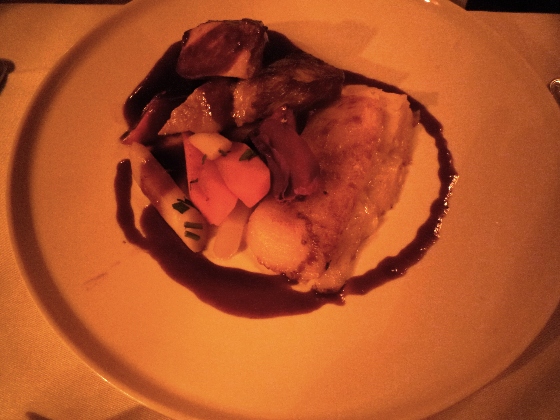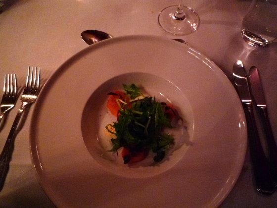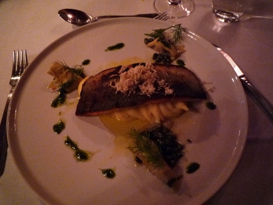 これは私の3コース。前菜はサーモン、メインに白身の魚(名前は忘れた)、デザートはよく分からないけど、